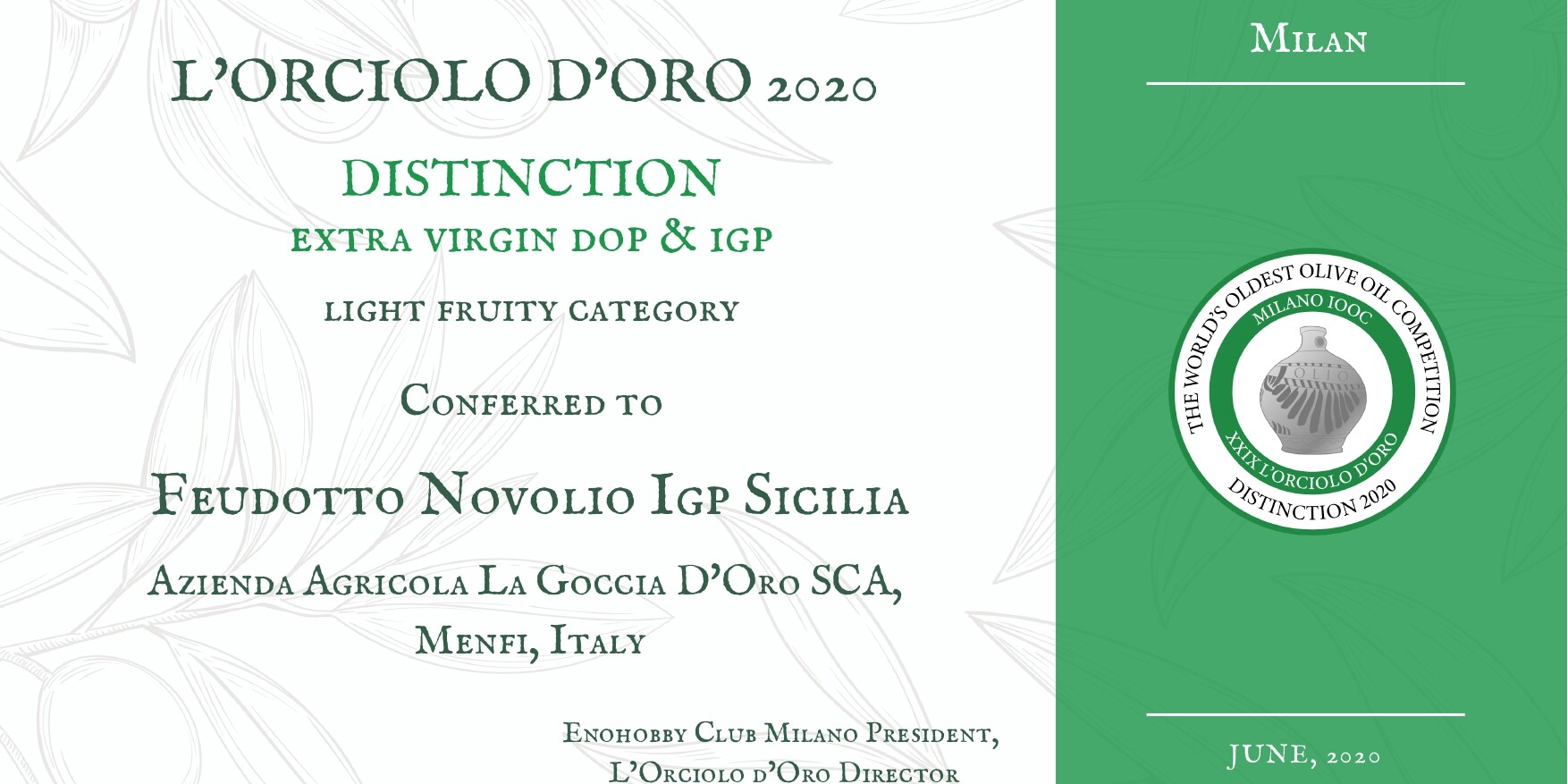 Il Feudotto Novolio IGP Sicilia ha ottenuto a questo importante concorso la “Distinzione”. Con questo premio si identifica un olio che si “distingue” per l’elevata qualità e per un importante equilibrio fra i vari sentori sia olfattivi che gustativi. Viene rilasciato pertanto un Diploma attestante i meriti acquisiti. Da quest’anno tale riconoscimento assume un’importanza maggiore per valore degno di lode e numero di Distinzioni assegnate di sole 10 per ogni categoria.